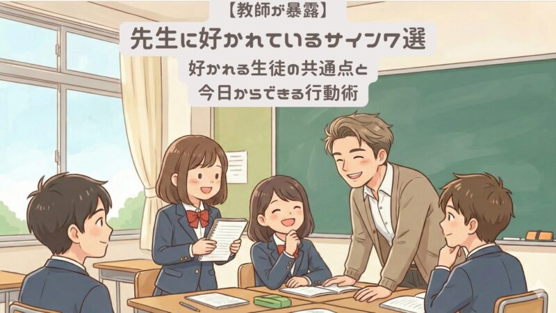 学校現場 【教師が暴露】先生に好かれているサイン7選|好かれる生徒の共通点と今日からできる行動術 こんにちは。高校教師えむへいです。学校生活を送っていると、ふと頭に浮かびませんか?私って先生に好かれているのかな?逆に嫌われている気がして不安…こう感じている子は本当に多いです。でも実は、先生に好かれているサインはかなり分かりやすく行動に出... 2026.01.01 学校現場